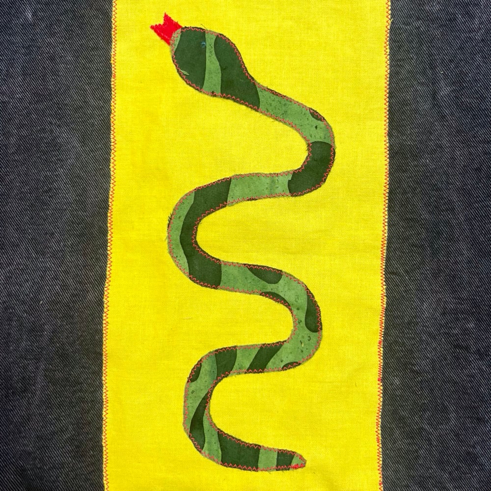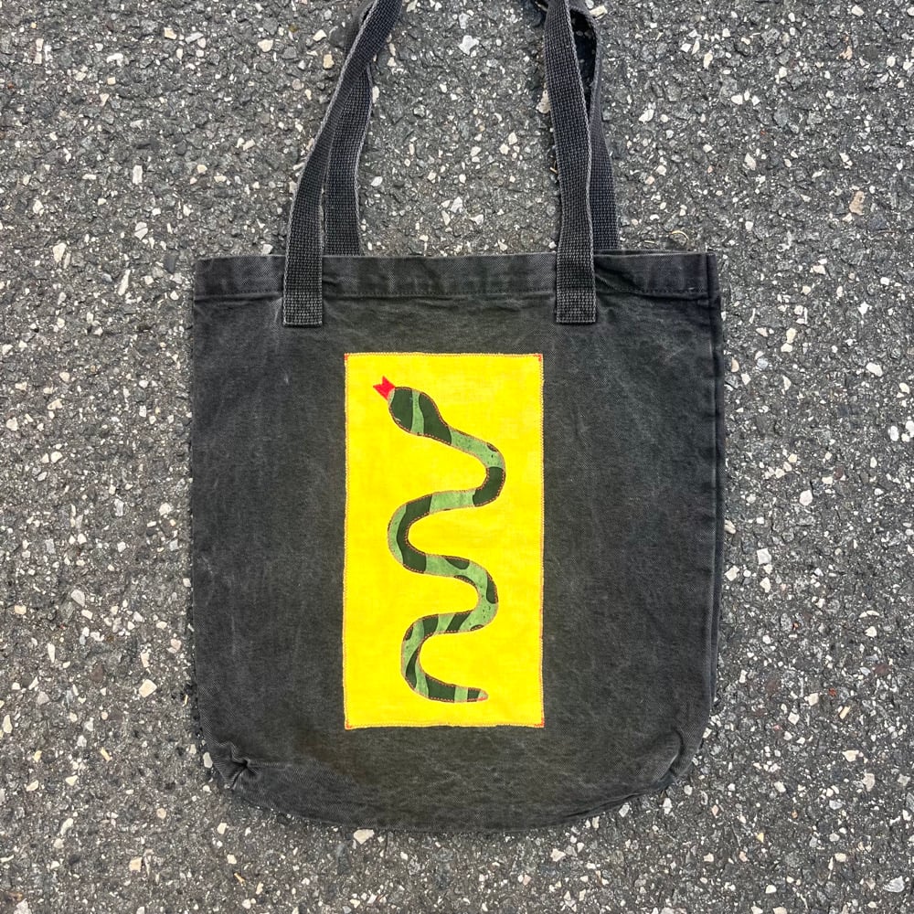 Upcycled garment-dyed bull denim tote bag. Super sturdy! For all your books, tchotchkes, and more. Appliquéd snake design on front. 100% cotton.