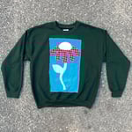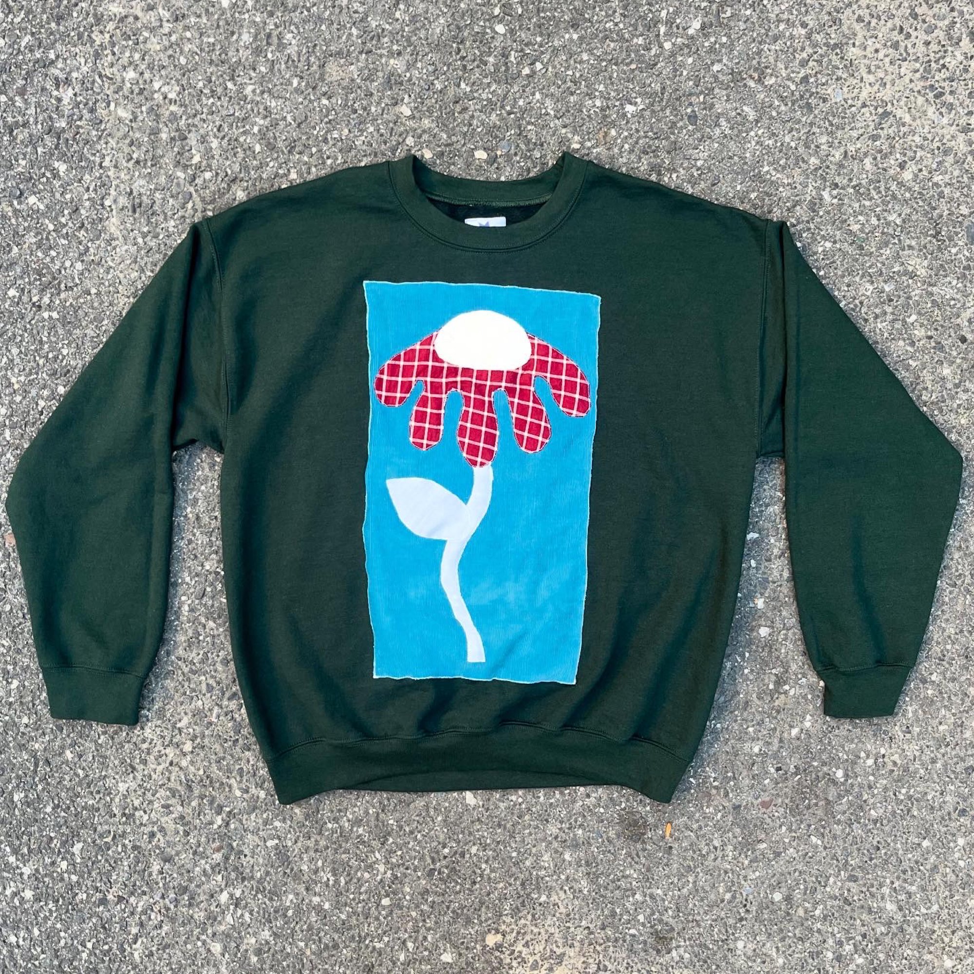 Hunter green crewneck sweatshirt in size L with large daisy appliqué design. 50% cotton, 50% polyester.