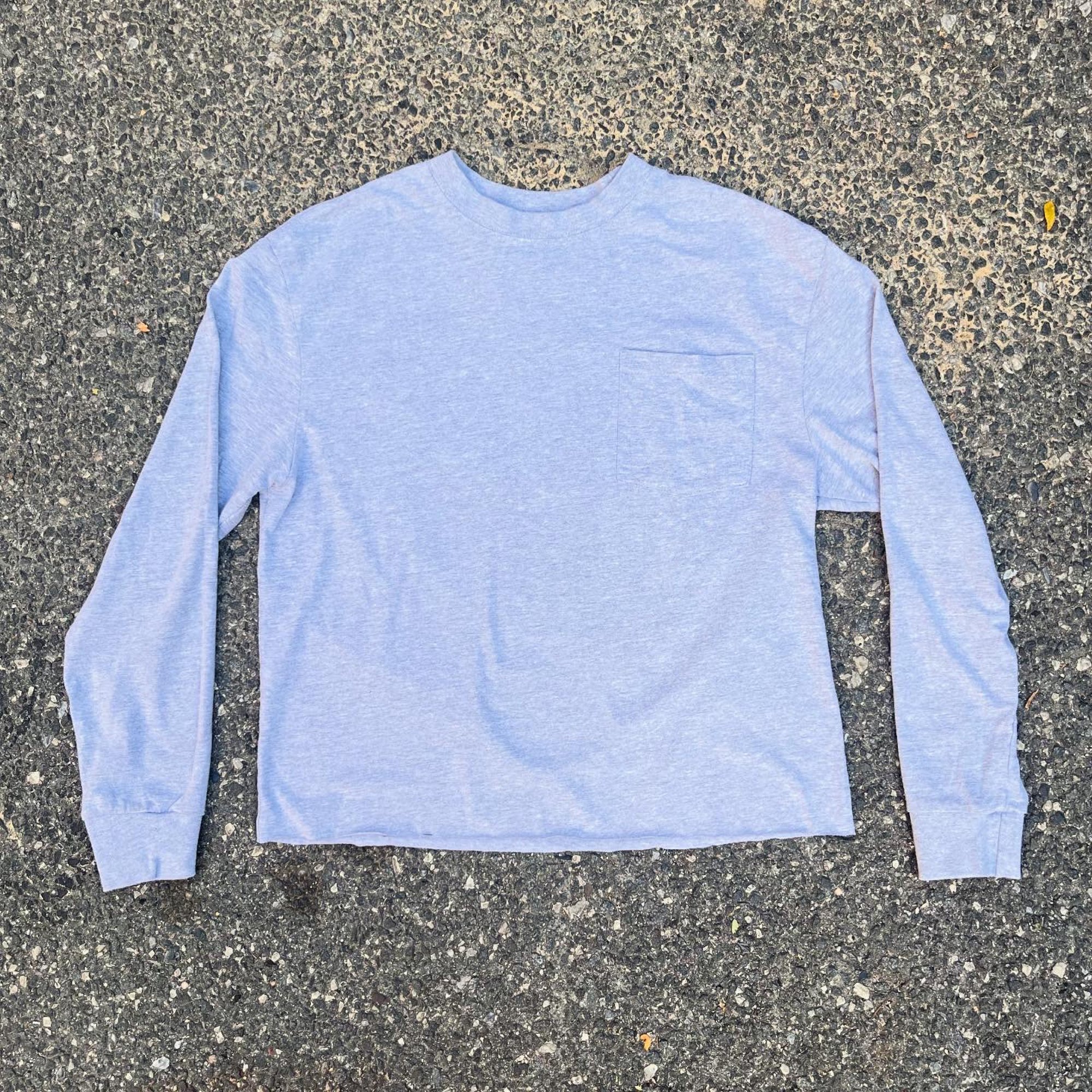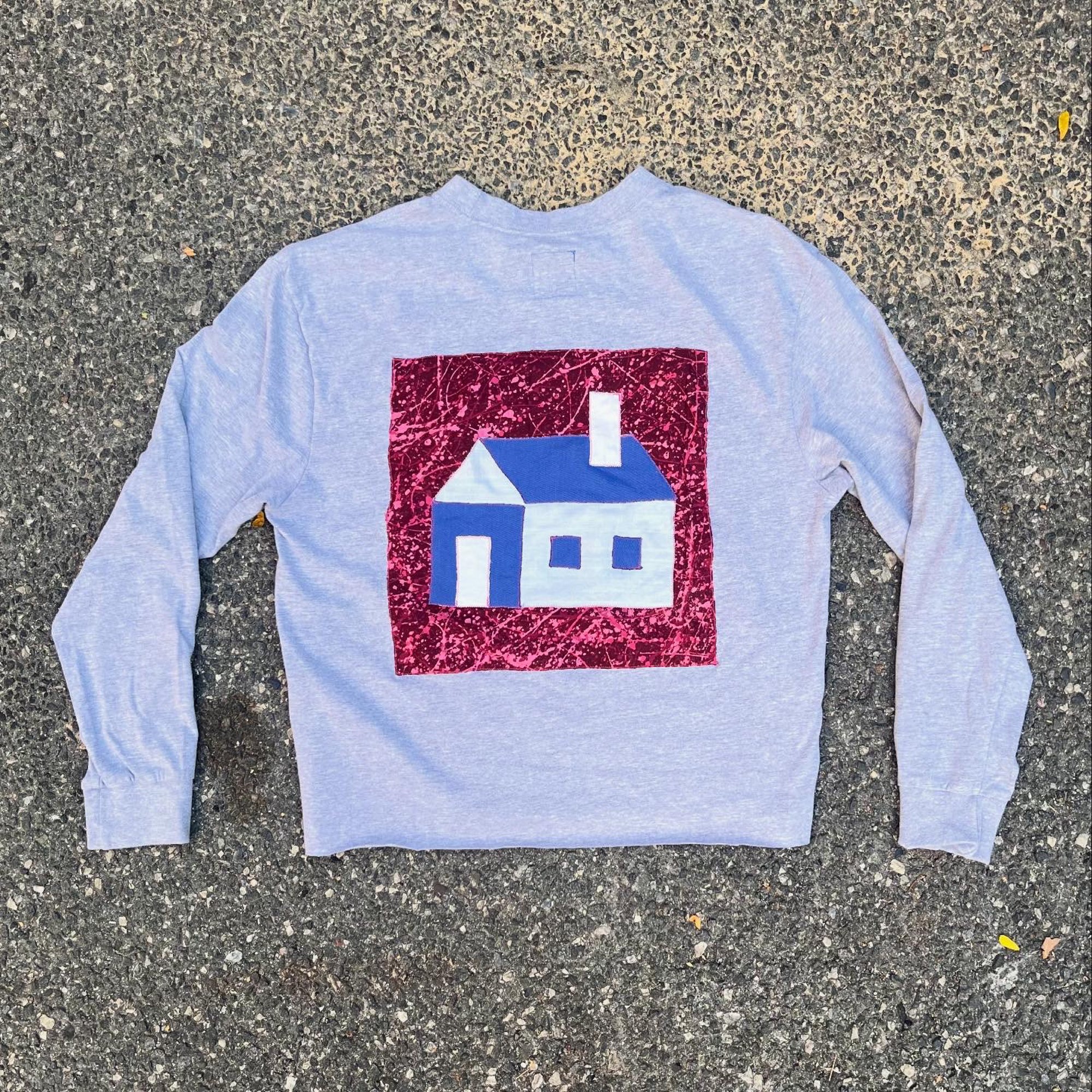 Heather gray long sleeve crewneck shirt with large back patch featuring a house appliqué design. 60% cotton/40% polyester base garment and 100% cotton design.