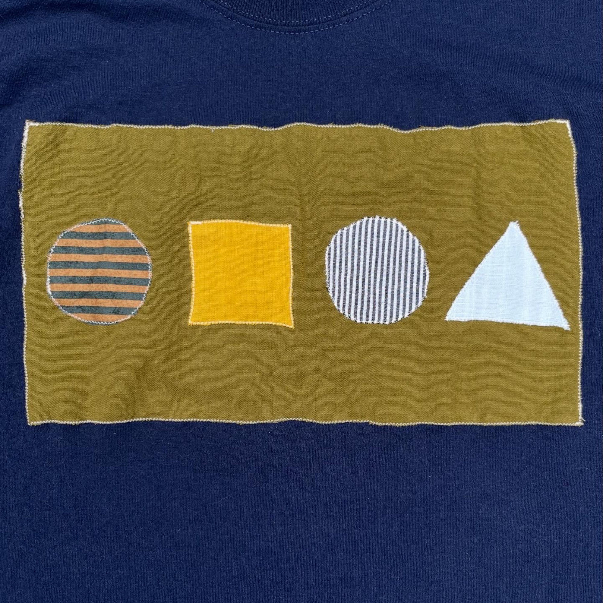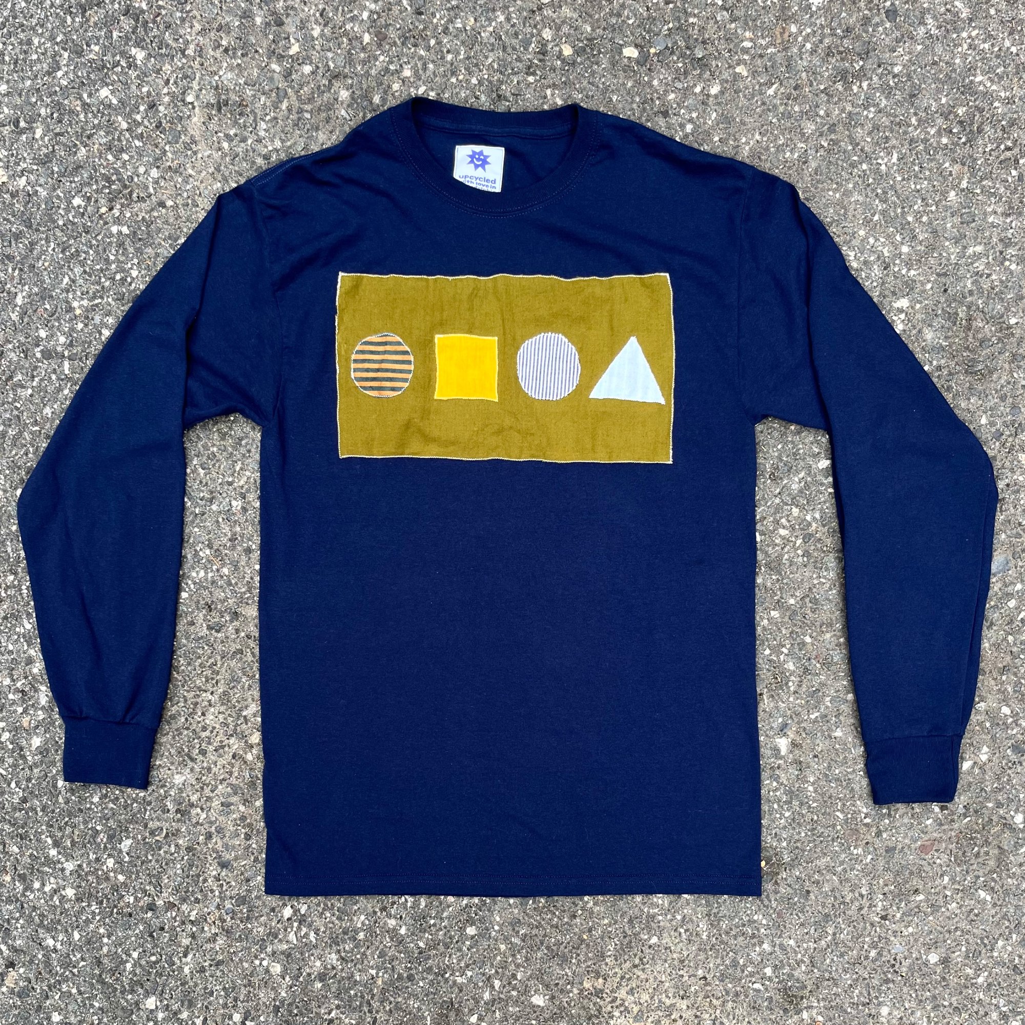 Navy long sleeve crewneck tee with earth-toned shapes appliqué design. 50% cotton, 50% polyester.