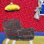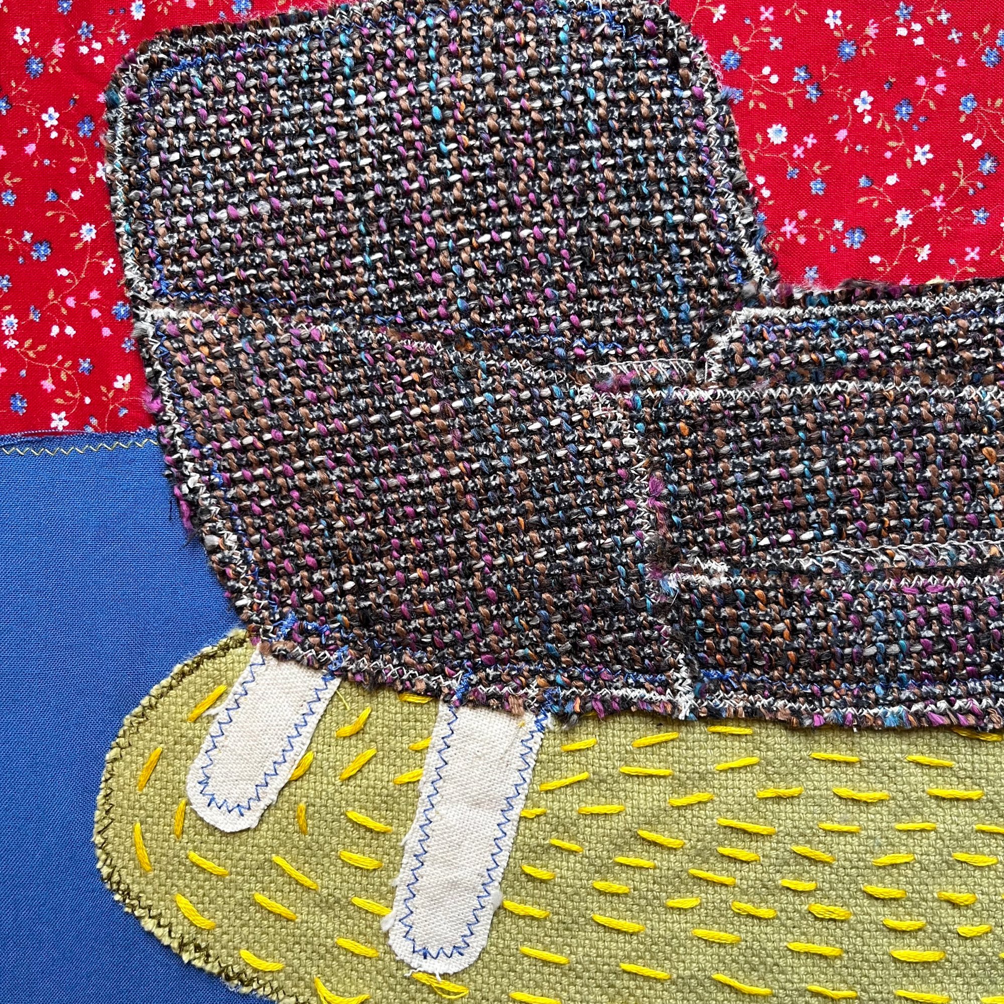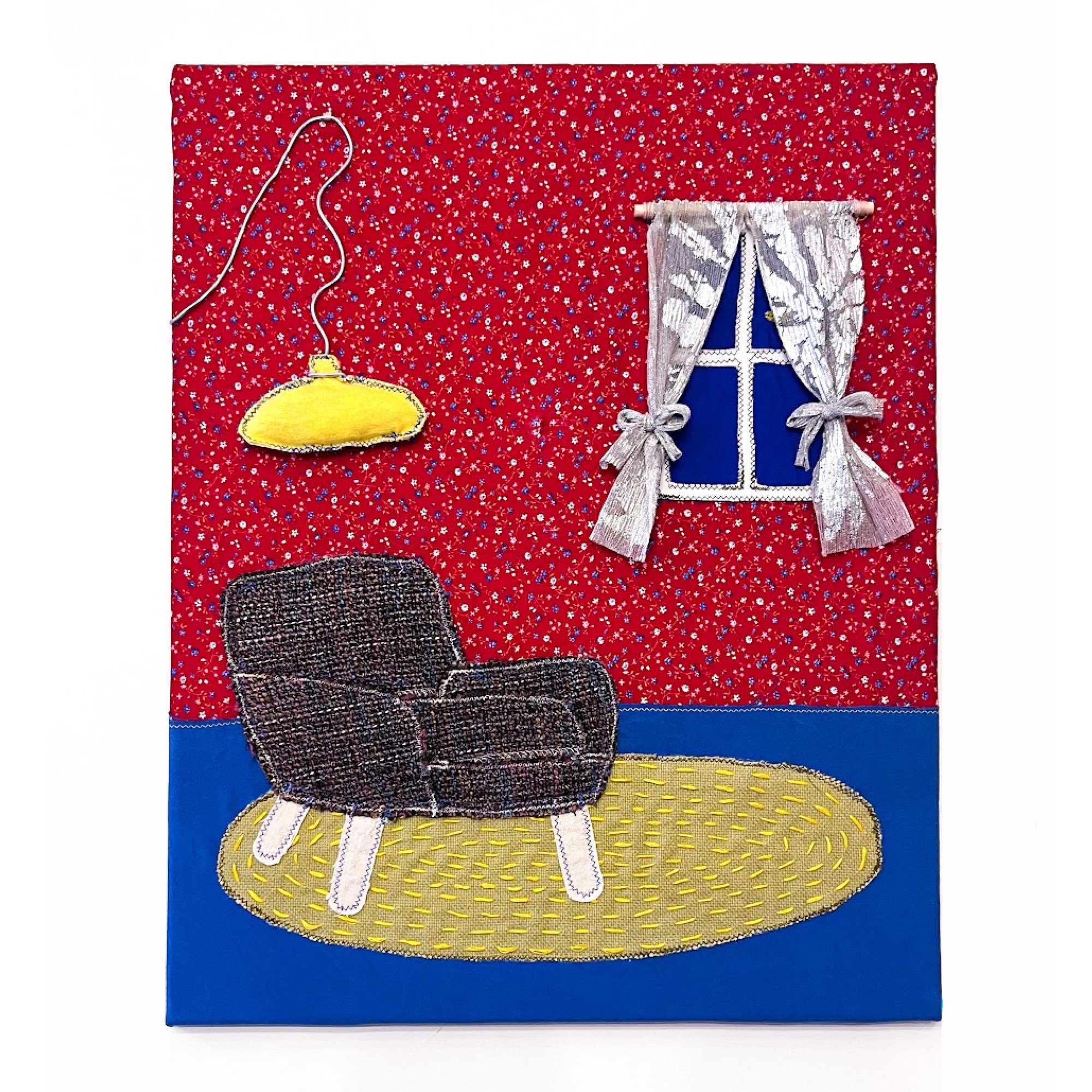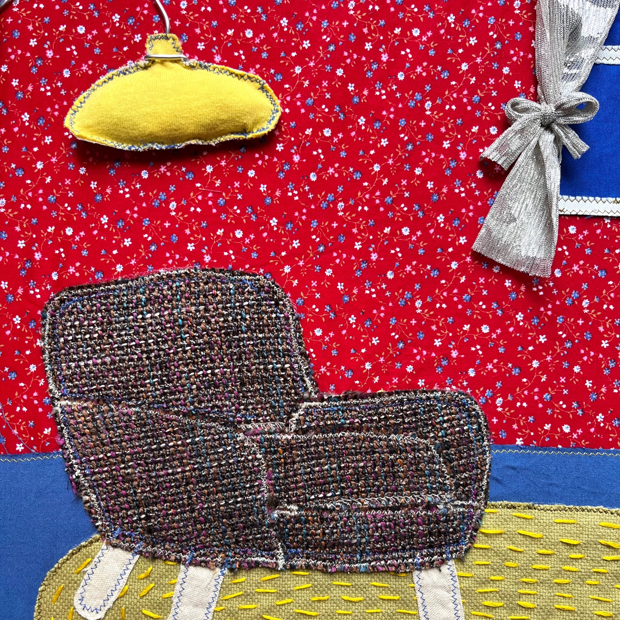 Cotton, nylon, upholstery fabric, embroidery floss, thread, wood, and aluminum wire on canvas.