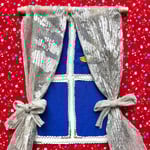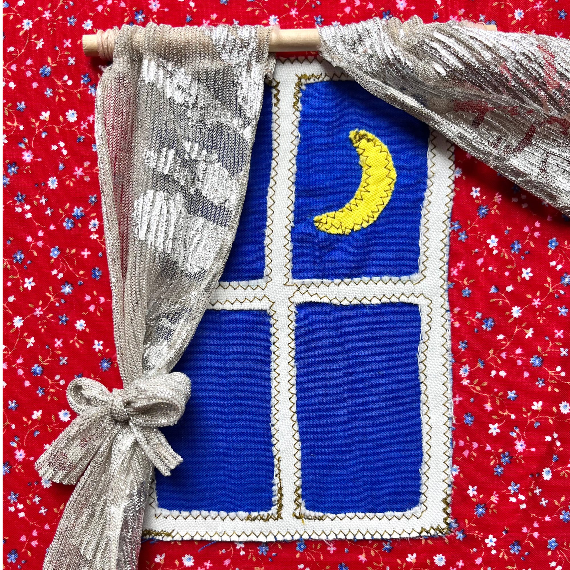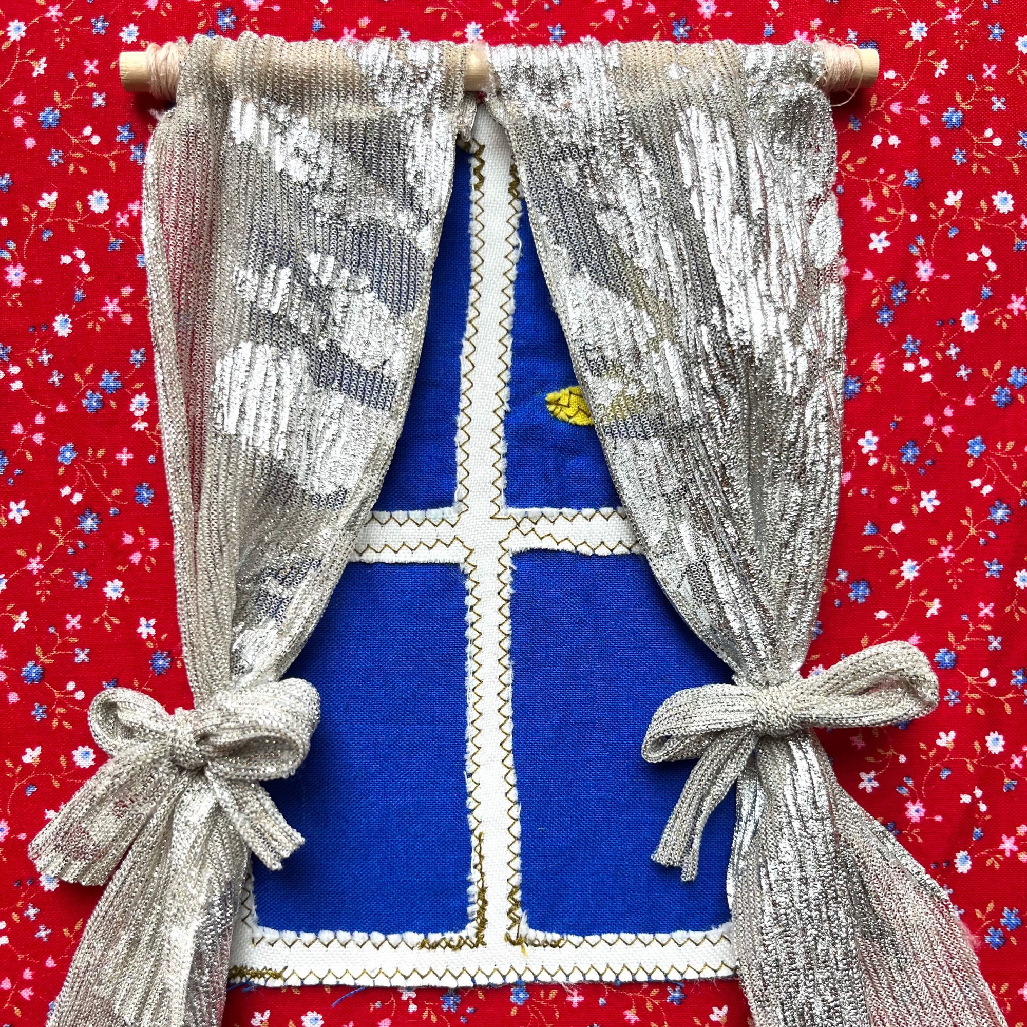 Upcycled mixed-media art piece on gallery-wrapped canvas. Features functional curtains!