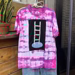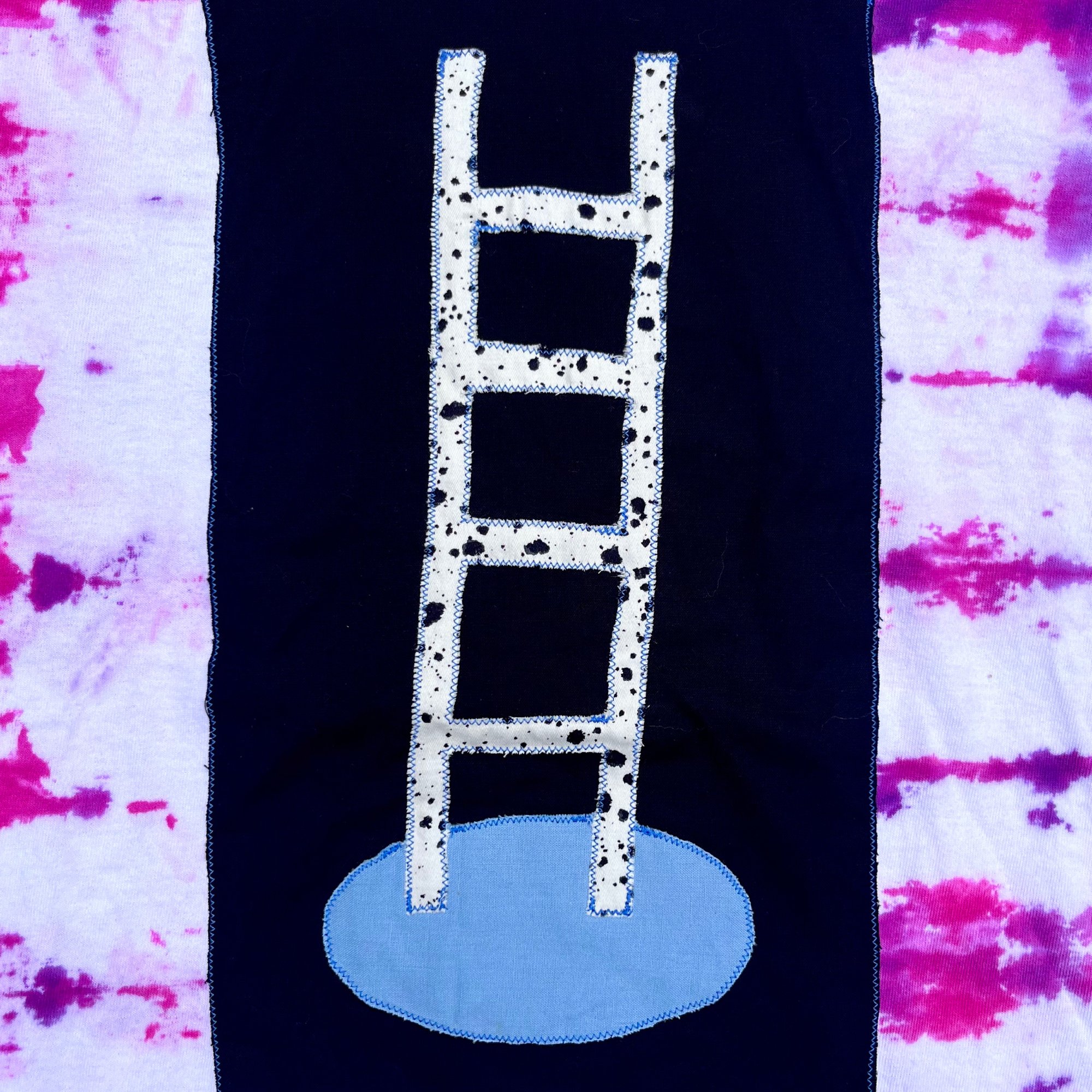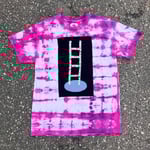 Magenta tie-dye t-shirt with ladder appliqué design. 100% cotton base garment and cotton and cotton/poly blend for the design.