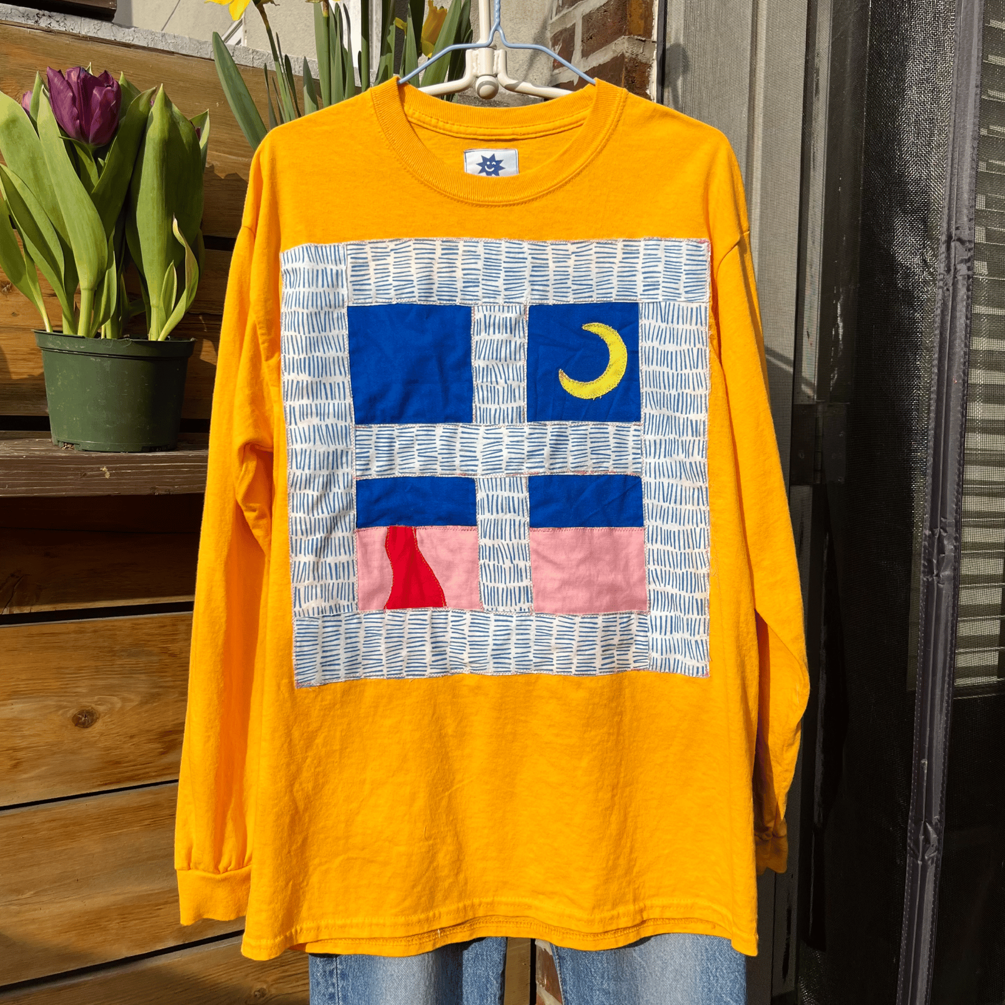 Yellow long-sleeve t-shirt with handmade window scene appliquéd graphic and contrast stitching. Size M. 100% cotton.