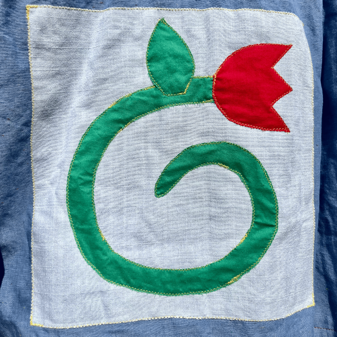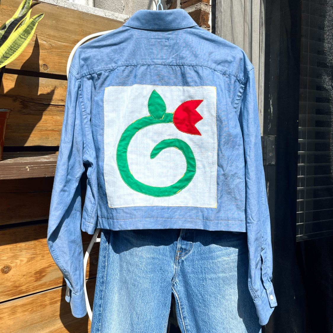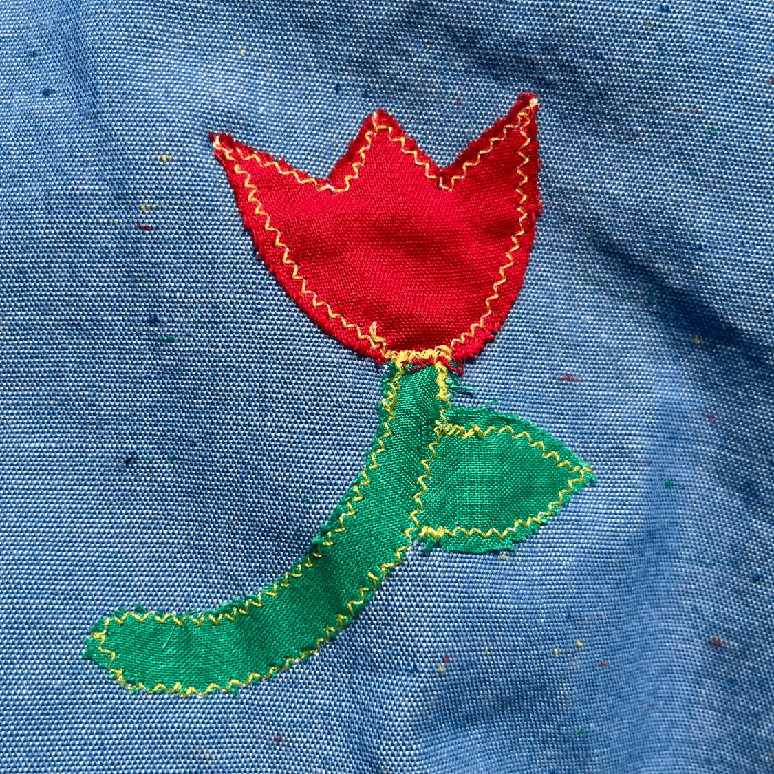 Light blue button-up cropped shirt featuring front and back handmade appliquéd tulip graphics with contrast stitching. Fabric contains small colorful speckles. Size S with an oversized boxy fit. 100% cotton.