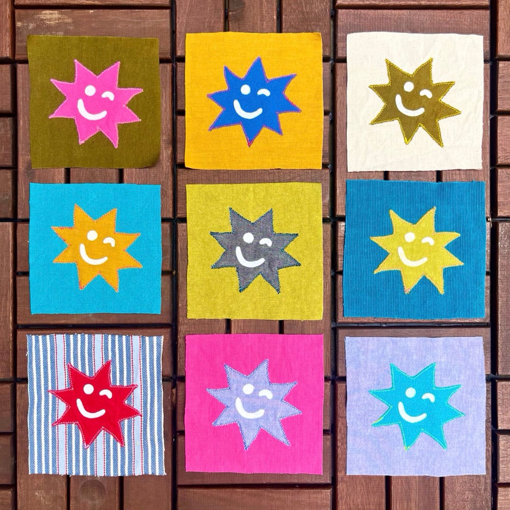 Sew-on patches made with scrap fabric measuring approximately 5x5 inches. Features a winking sun appliqué with a hand-drawn paint marker face and contrast thread. Materials may include cotton, linen, corduroy, and poly/cotton blend.